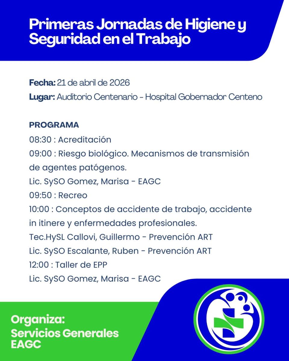 Desde el establecimiento Asistencial Gobernador Centeno (General Pico - La Pampa) invitan a participar de la Primera Jornada de Higiene y Seguridad en el Trabajo organizada por Oficina de Servicios Generales.